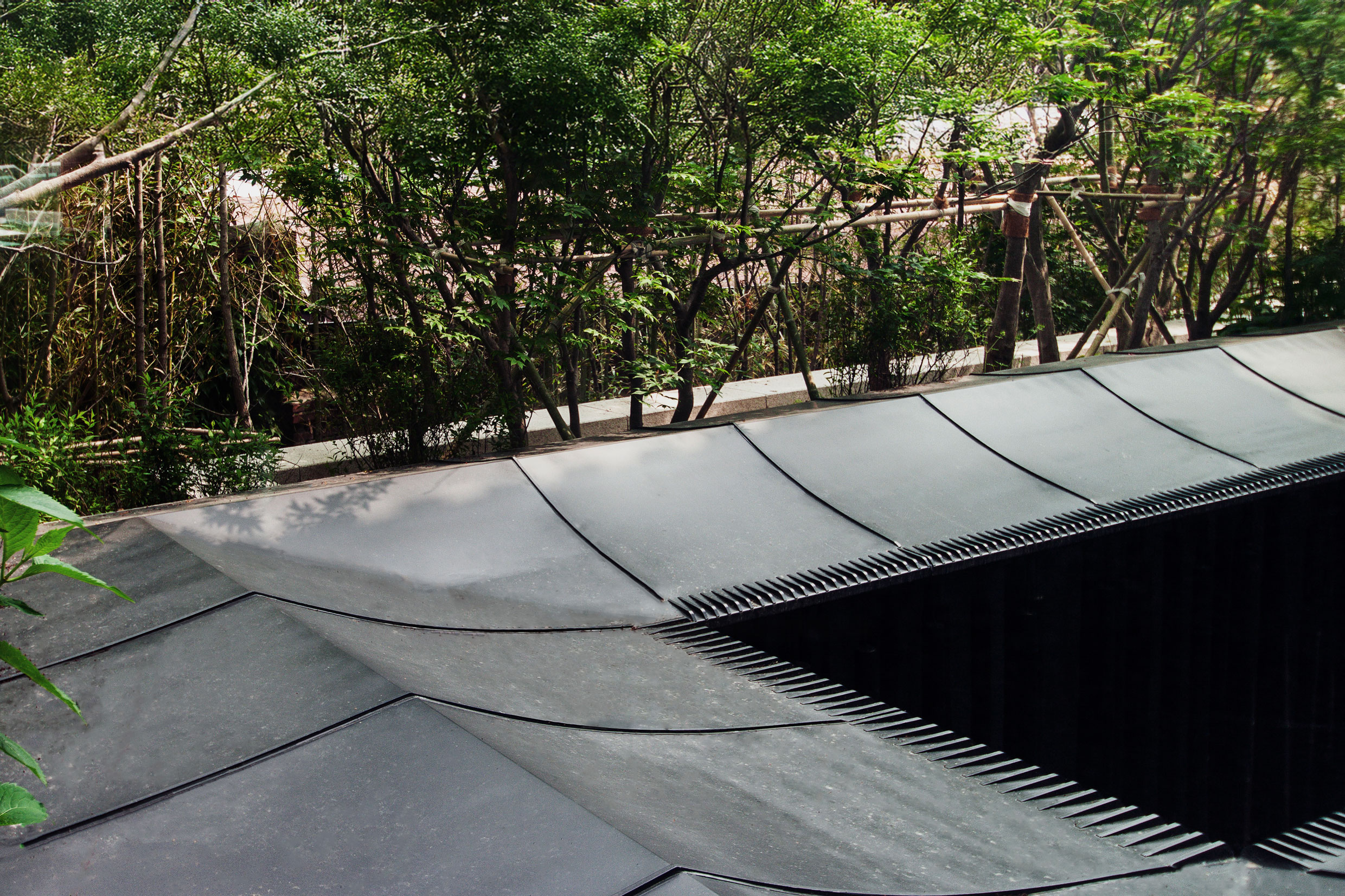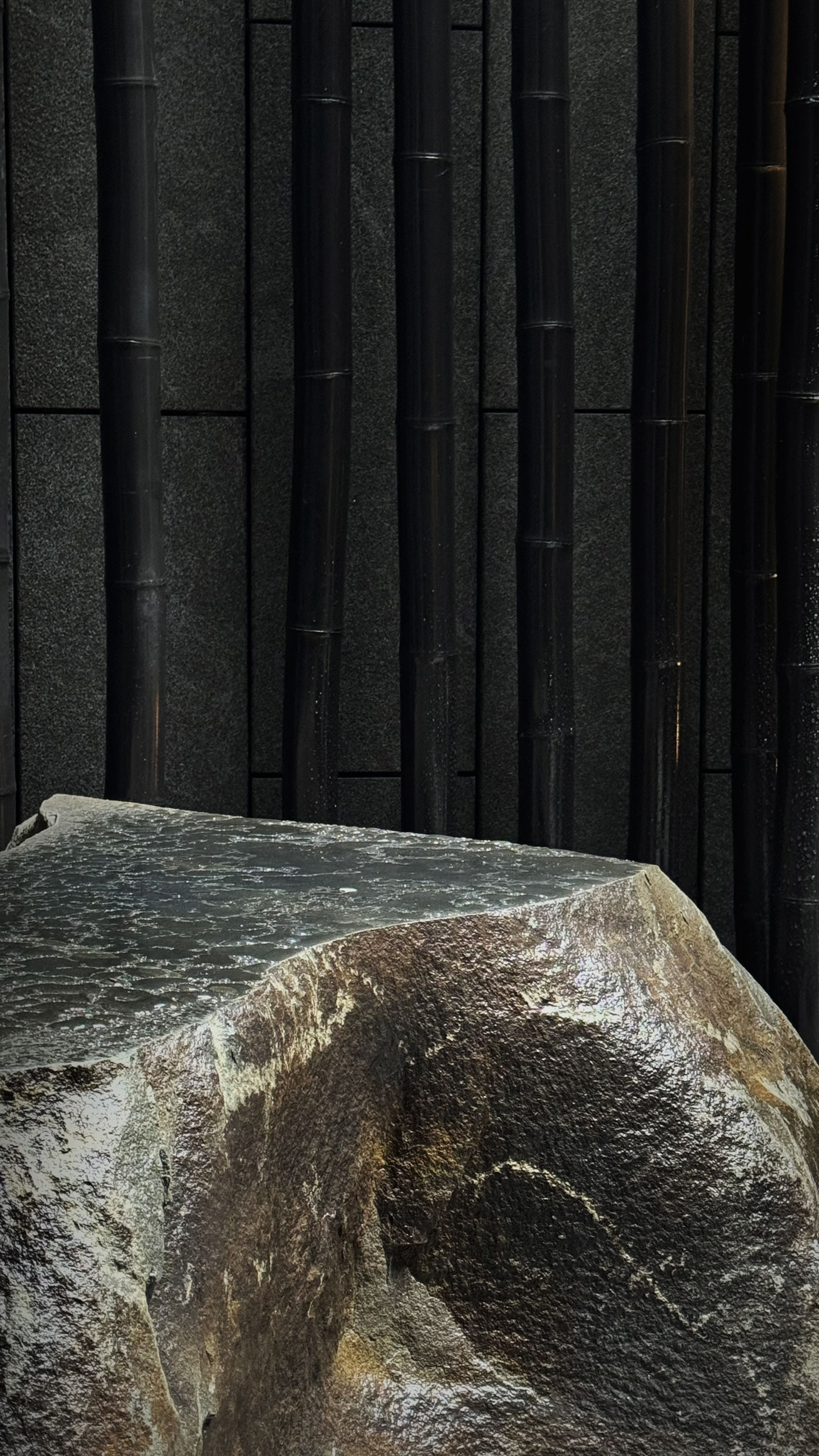 선혜원의 가장 깊고 내밀한 곳에 빛의 정원이 숨어있다. 따스한 어둠이 깃든 지하 바의 벽을 밀어 젖히면 마법처럼 시원한 빛이 쏟아진다. 여섯평 남짓한 이 지하공간은 사방이 높은 벽으로 막혔으나 하늘이 열렸다. 건축법에 의해 의도치 않게 태어났지만 자리가 책임을 부여했다. 실내가 암이라면 이곳은 명이다. 우리 선조들은 검은 먹과 투명한 물 단 두가지 재료로 농담을 조절하여 화선지 위에 아름다운 빛을 표현했다. 이곳의 빛도 먹과 물로써 드러난다. 하늘을 두른 검은 처마는 조리개가 되어 빛을 모은다. 벽을 감싼 묵죽은 검게 칠한 대나무 구조체로 하늘의 빛을 받아 은연히 땅을 비춘다. 묵죽 너머엔 먹의 벽과 혼합된 물이 잘게 부서지며 흐른다. 부서진 물은 각자의 빛을 담아 향연을 펼친다. 수묵화는 정원이 된다.